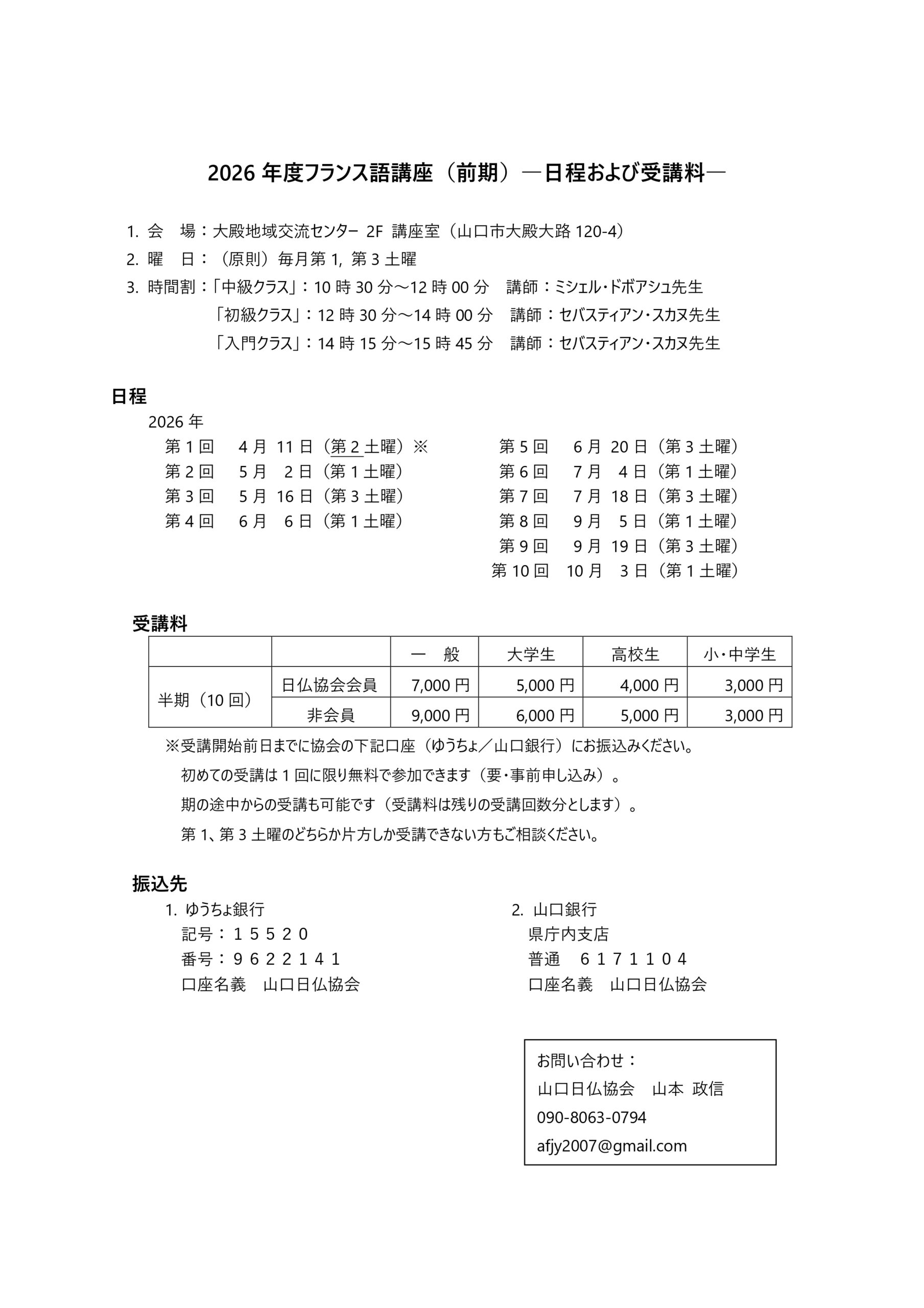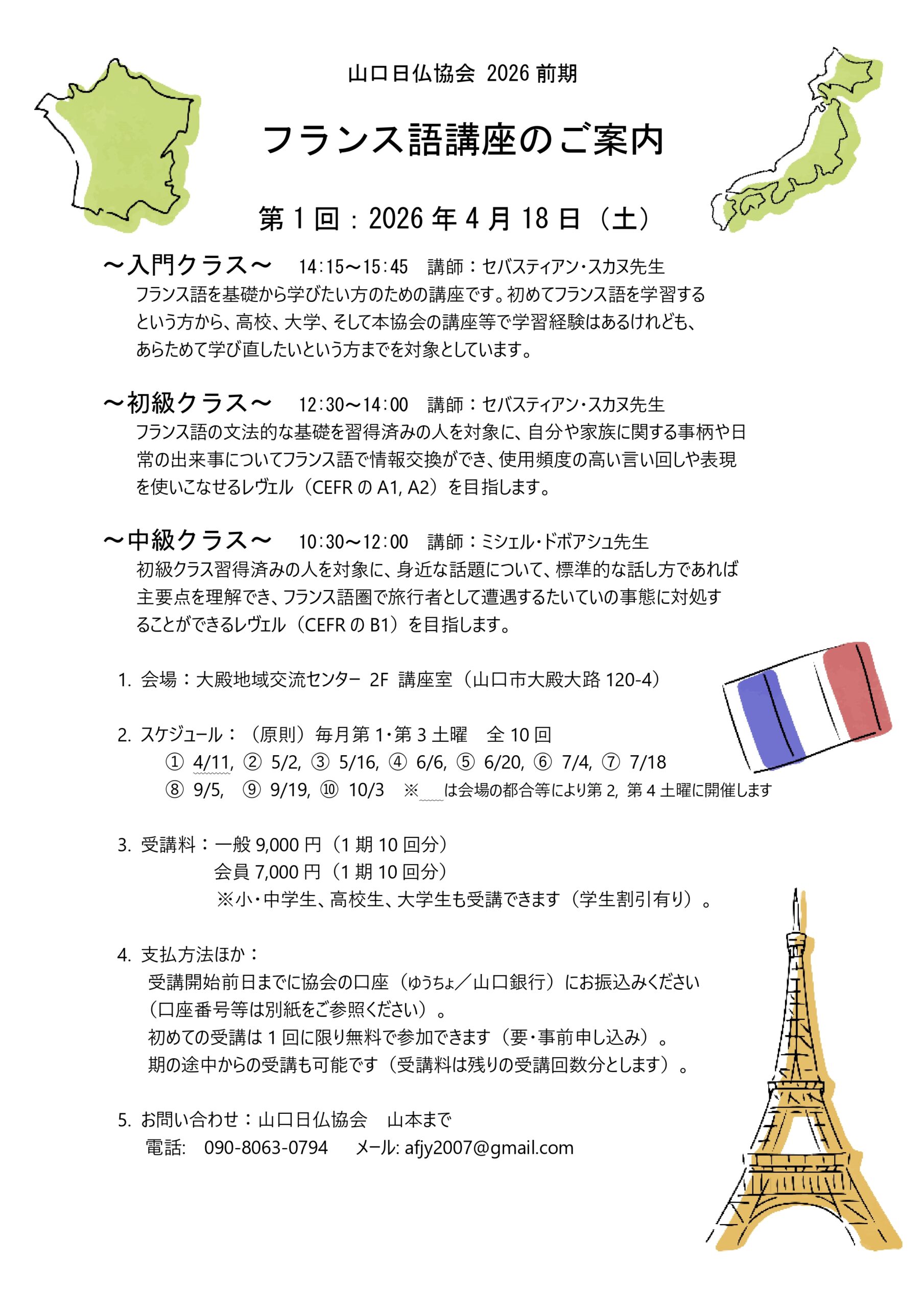 山口日仏協会 2026前期 フランス語講座のご案内