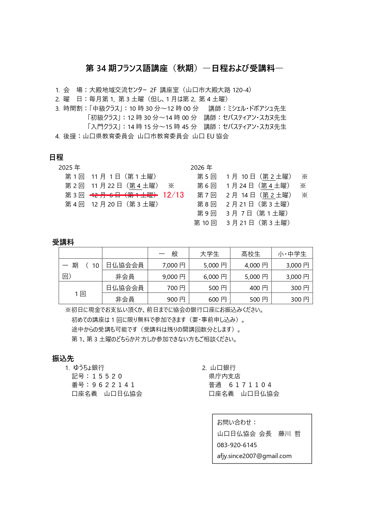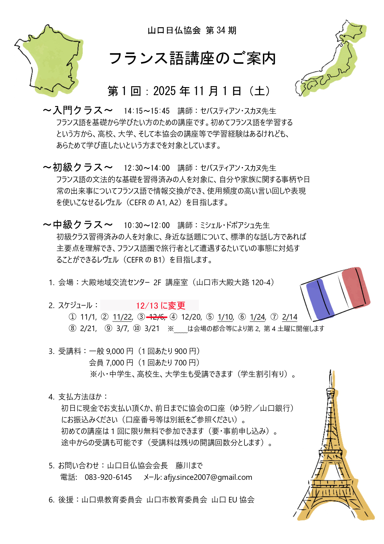 山口日仏協会 第34期フランス語講座のご案内(日程変更)
